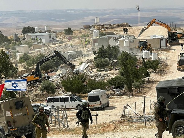 ‘In under two hours, Israeli military forces demolished nine houses, six residential caves, 11 bathrooms, ten water tanks, seven water cisterns, four animal shelters, an electricity room, the majority of the village’s solar panels, and the community centre. By the time the army left, only four structures remained’