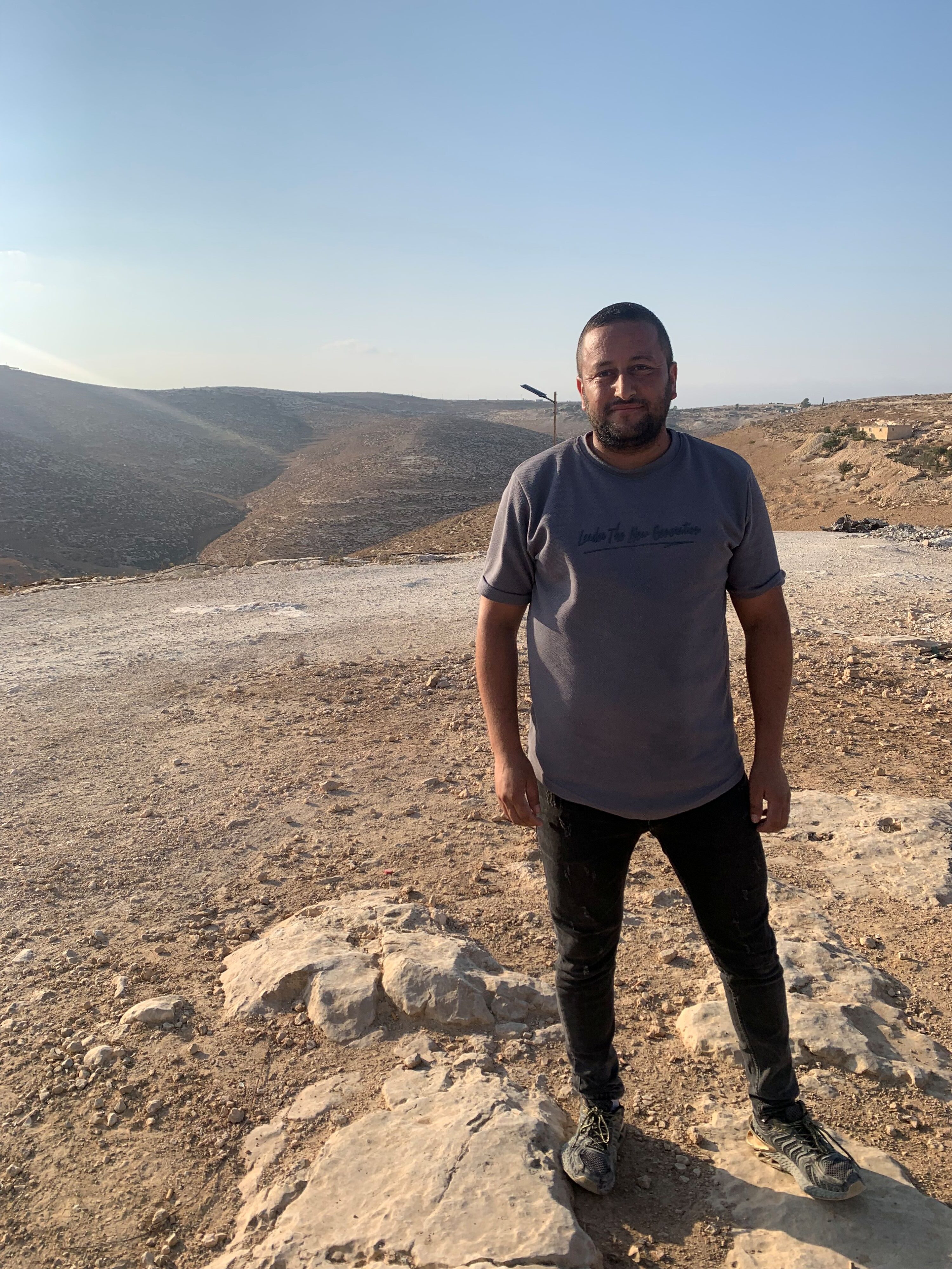 We stand in the idyllic surroundings of Masafer Yatta, a collection of Palestinian hamlets on the southern edge of the occupied West Bank. Endless rolling hills stretch out in every direction. Each rise and fall accentuates the landscape, where shepherds have roamed for thousands of years. The earth is dry and the sun is beating down on us.